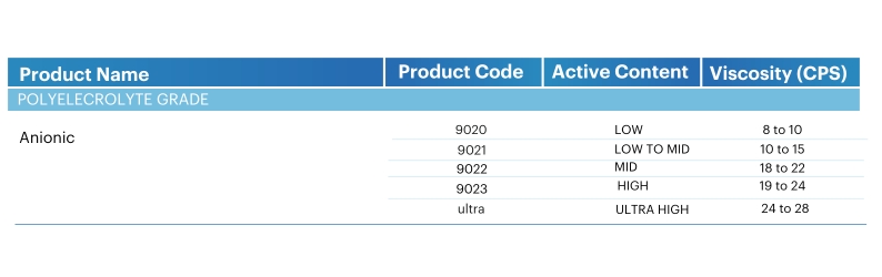 | ANIONIC | 9020 | LOW | 8 to 10 |